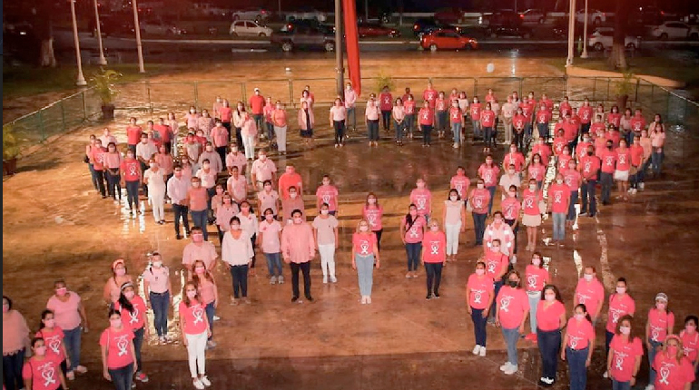 El voluntariado del Colegio de Bachilleres del Estado de Quintana Roo acompañó el día de ayer a la Sra. Gaby Rejón de Joaquín, Presidenta del Sistema DIF Quintana Roo, a la formación del lazo y encendida de luces en conmemoración al día de Lucha contra el Cáncer de Mama.