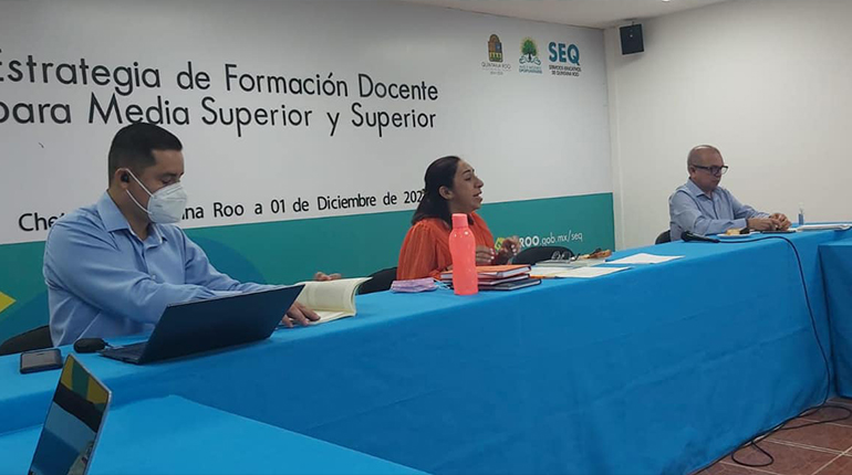 El Colegio de Bachilleres, representado por su titular el Dr. Rafael Romero Mayo, estuvo presente en el evento “Estrategia de Formación Docente para Media Superior y Superior”, que encabezó la Mtra. Ana Isabel Vásquez Jiménez, Secretaria de Educación de Quintana Roo, donde se resaltó el papel relevante en las competencias de los maestros para la mejora en la calidad de aprendizaje de los estudiantes y mediar su formación.